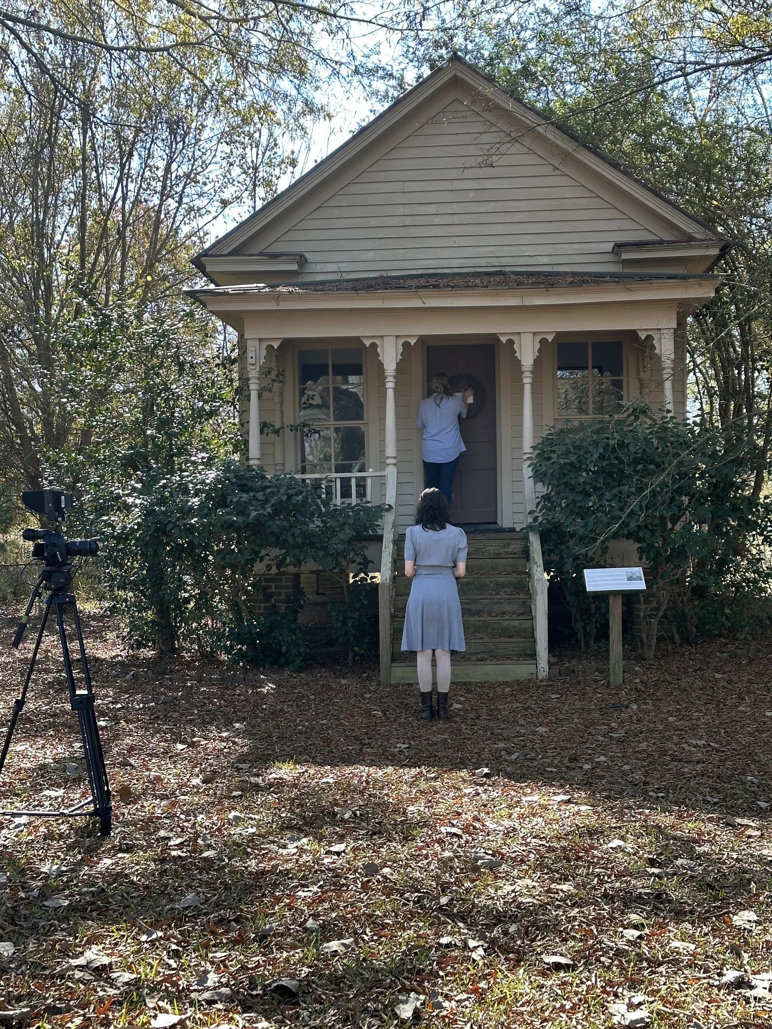 12/07/23 — Last month, Camille spent two weeks shooting a short film, Enemy of Death, in Goldsboro, NC. Originally from central NC, it was a pleasure to be back to enjoy the glorious fall weather and work with students from East Carolina University’s School of Art & Design on this project! Set in the 1950s in a small Southern town, the film features Ruth (Camille Martine), a newcomer who moves into her late grandmother’s home and begins to suspect a local religious movement sweeping the town as responsible for her death. Shot in Old Waynesborough Park, it features many historic buildings including a former Quaker Meeting house from the 1800s and an old one-room schoolhouse. Eery, subtle, and suspenseful, this film is sure to surprise you at the end! Stay tuned for updates regarding its release.